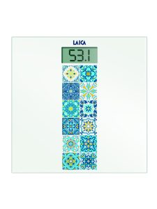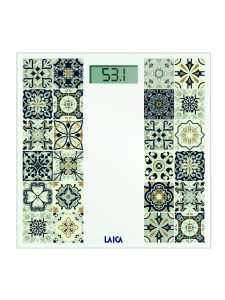 Una piattaforma in vetro temperato da 6 mm, decorata con grafiche mediterranee e un display chiaro e leggibile. Ha una portata fino a 180 kg e offre quel mix di robustezza ed estetica che si adatta bene a bagni moderni e classici.